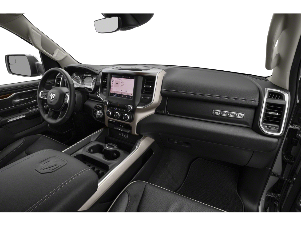 The interior of this Laramie trim level is equally impressive, featuring luxurious leather-trimmed bucket seats, a full-length upgraded floor console, and a stunning 12-inch touchscreen display with integrated navigation. The advanced Uconnect 5 infotainment system provides seamless connectivity, including Apple CarPlay, Android Auto, and SiriusXM with 360L.